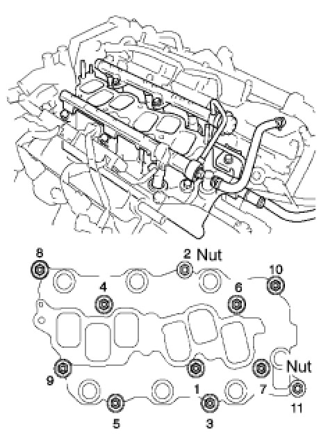 (a) Install the intake manifold with the 9 bolts, 2 nuts and 2 washers. Using several steps, tighten the bolts and nuts uniformly in the sequence shown in the illustration.