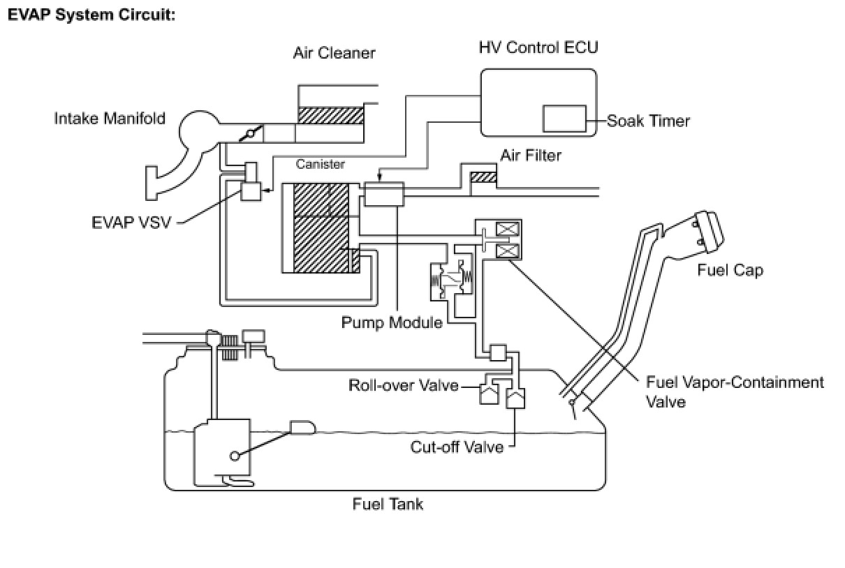 While the engine is running, if a predetermined condition (closed loop, etc.) is met, the EVAP VSV is opened by the ECM (Included in HV control ECU) and stored fuel vapors in the canister are purged to the intake manifold. The ECM will change the duty cycle ratio of the EVAP VSV to control purge flow volume.