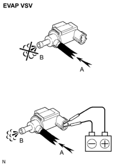 (b) Apply compressed air to the EVAP VSV, and confirm that no air flows from A to B as shown in the illustration.