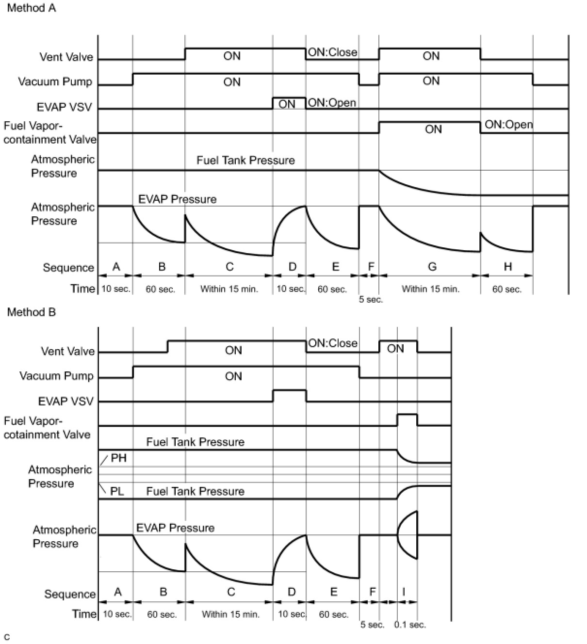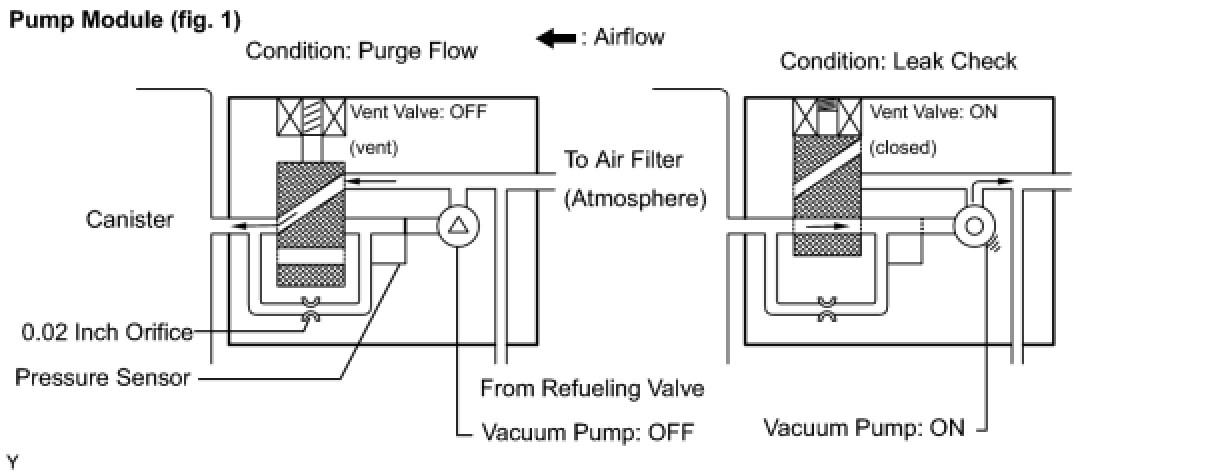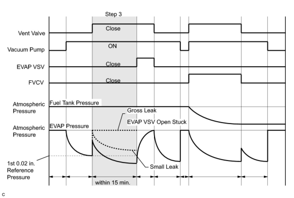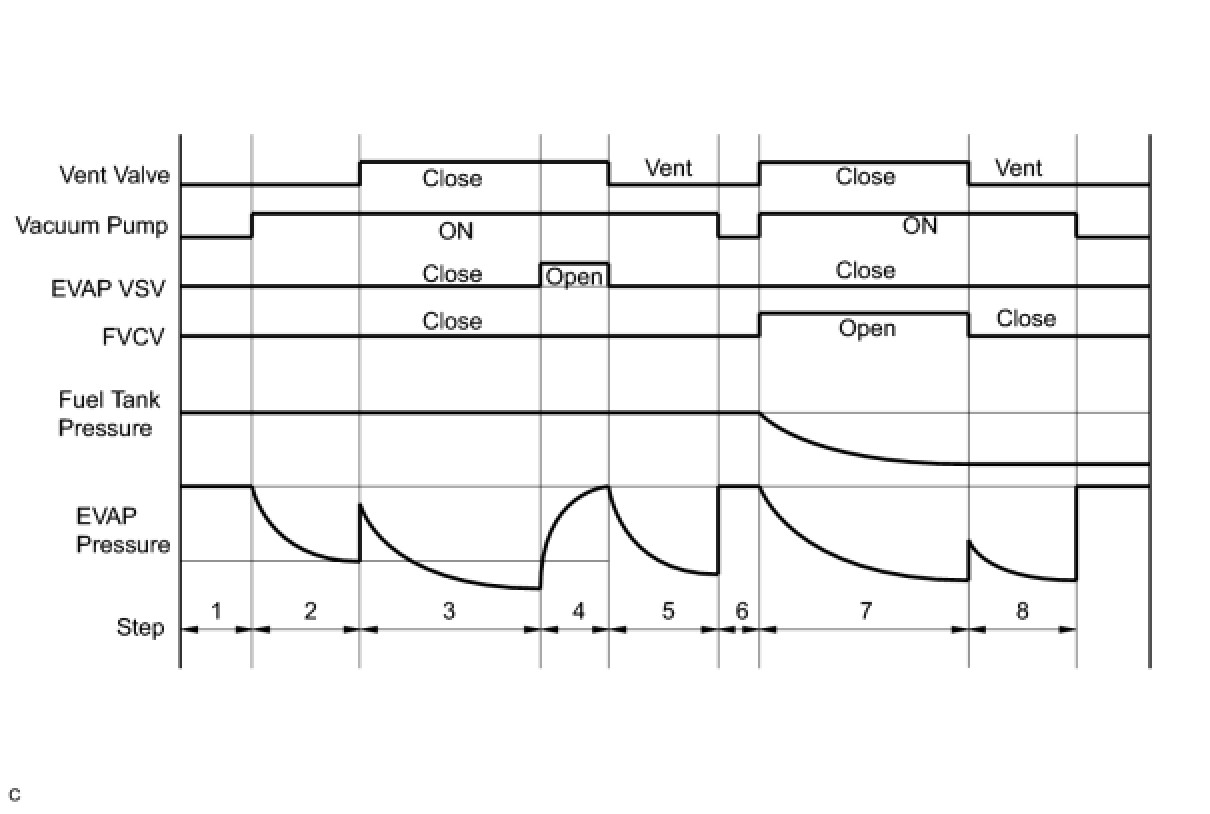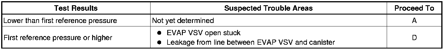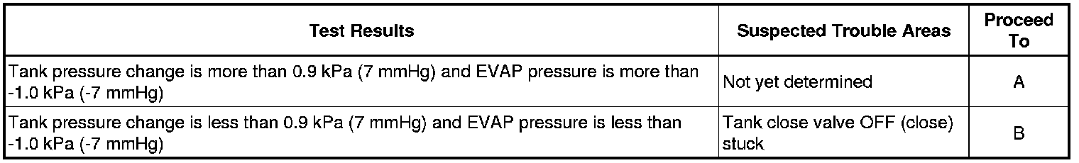 1 If the fuel tank pressure is higher or lower than the atmospheric pressure, the system determines that there are no leaks in the closed tank system and the system will check for leaks from the piping and canister between the EVAP VSV and pump module. (Method A)