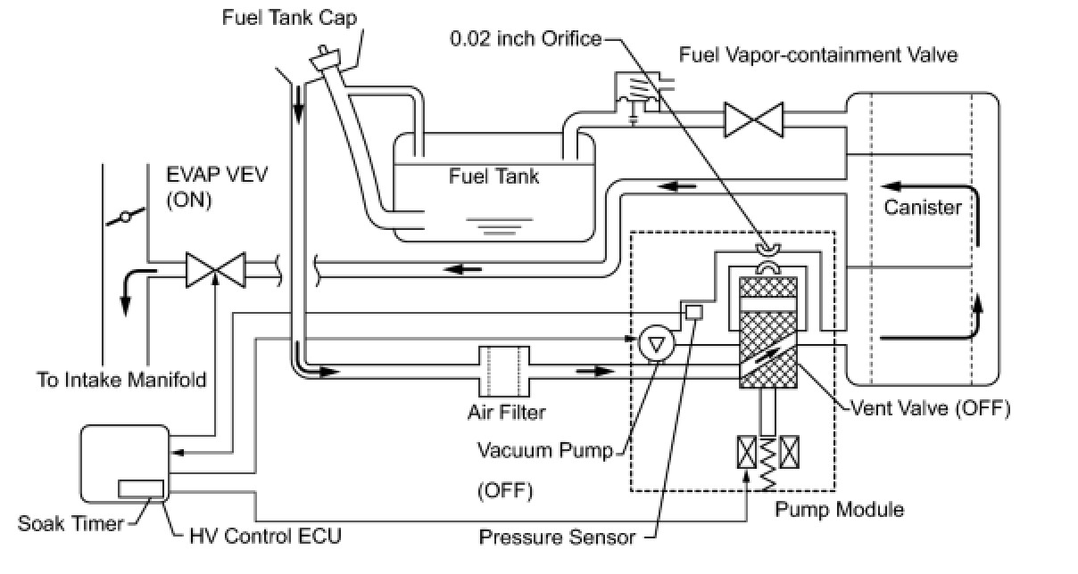 This monitoring system checks for pump module malfunctions and leaks from the EVAP and closed tank systems. Be sure to leave the vehicle for at least 5 hours to sufficiently cool the fuel and stabilize fuel tank pressure. This makes EVAP system monitoring more accurate.