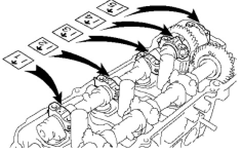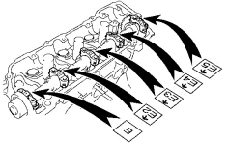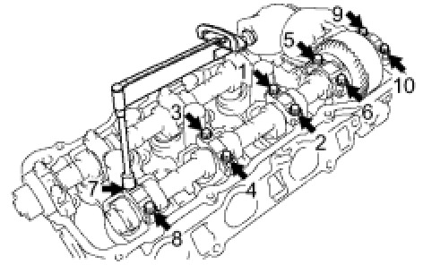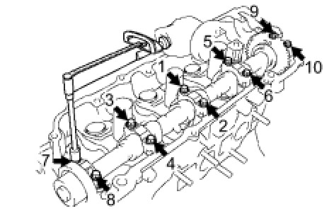 Using several steps, tighten the 10 bearing cap bolts uniformly in the sequence shown in the illustration.