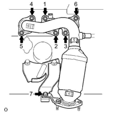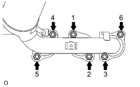 Install the exhaust manifold converter No.2 with the 6 nuts and bolt. Using several steps, tighten the nuts uniformly in the sequence shown in the illustration.