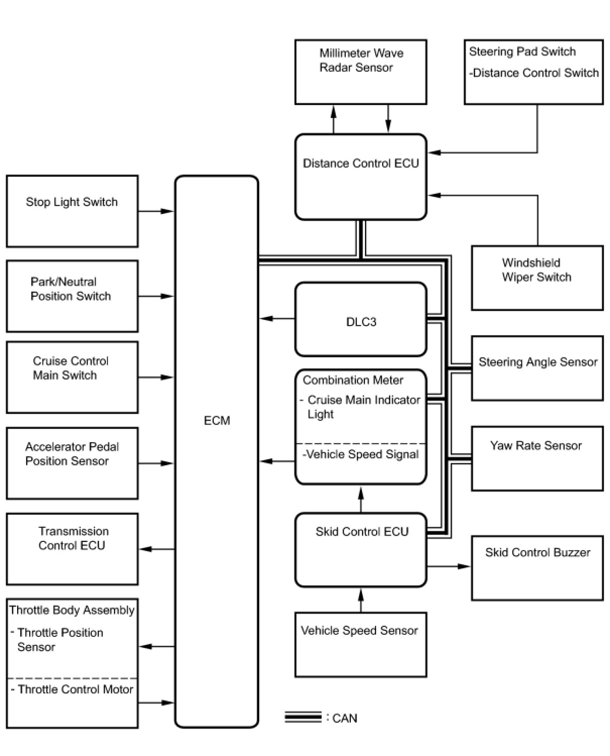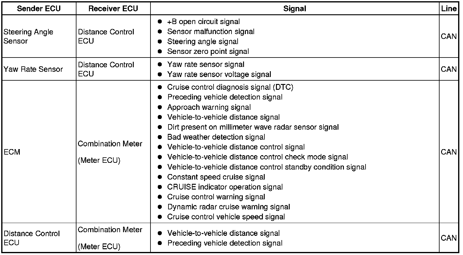 (d) The millimeter wave radar sensor and the distance control ECU control the system while the vehicle-to-vehicle distance control mode is in operation, and send signals to each actuator and ECU.