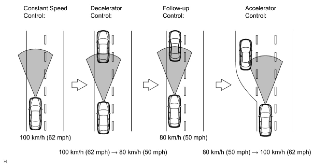 (g) The following illustration shows a control example under the following conditions: own vehicle speed is 100 km/h (62 mph) and the speed of the vehicle in front is 80 km/h (50 mph).