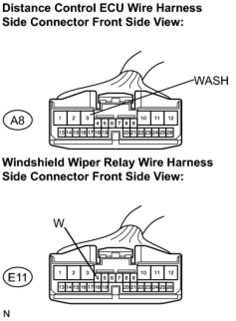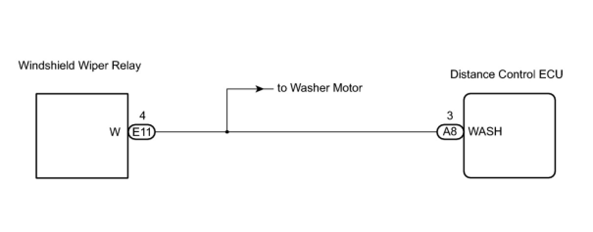 The distance control ECU detects washer operation. The cruise control will be cancelled by the distance control ECU if the windshield wipers operate in HI mode for 5 seconds or more. By detecting washer operation, the distance control ECU allows the cruise control to continue even when the windshield wipers operate in HI mode.