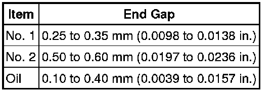 If the end gap is greater than the maximum, replace the piston ring. If the end gap is greater than the maximum even with a new piston ring, rebore all the 6 cylinders or replace the cylinder block.