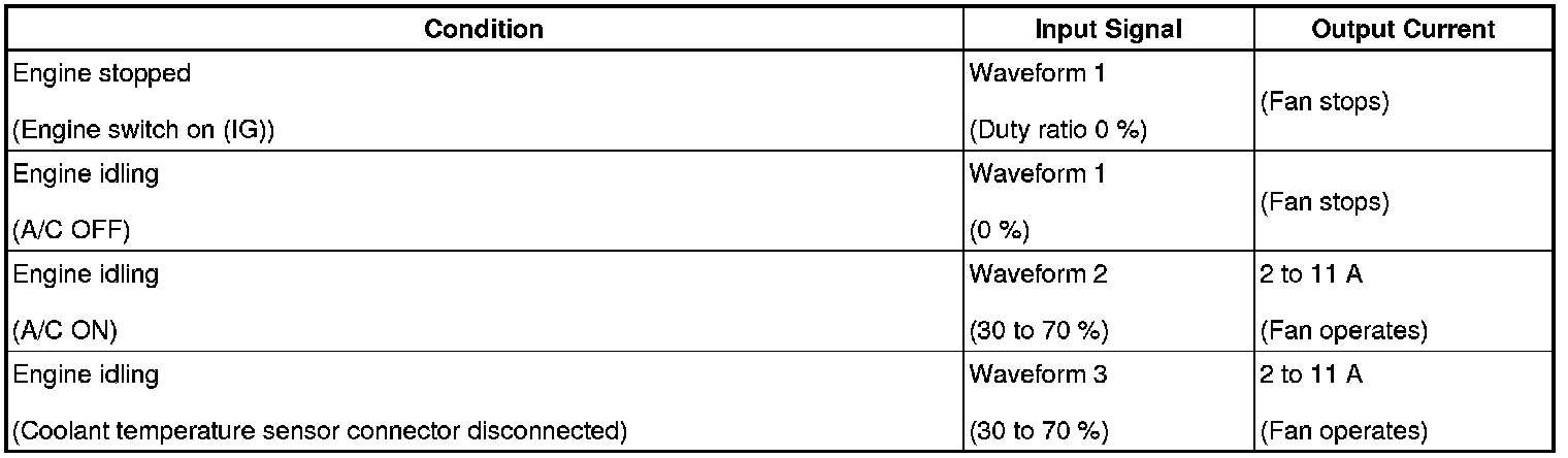 - If the output current is abnormal even when the input signal is normal, there is a malfunction in the cooling fan ECU (RFC) or motor.