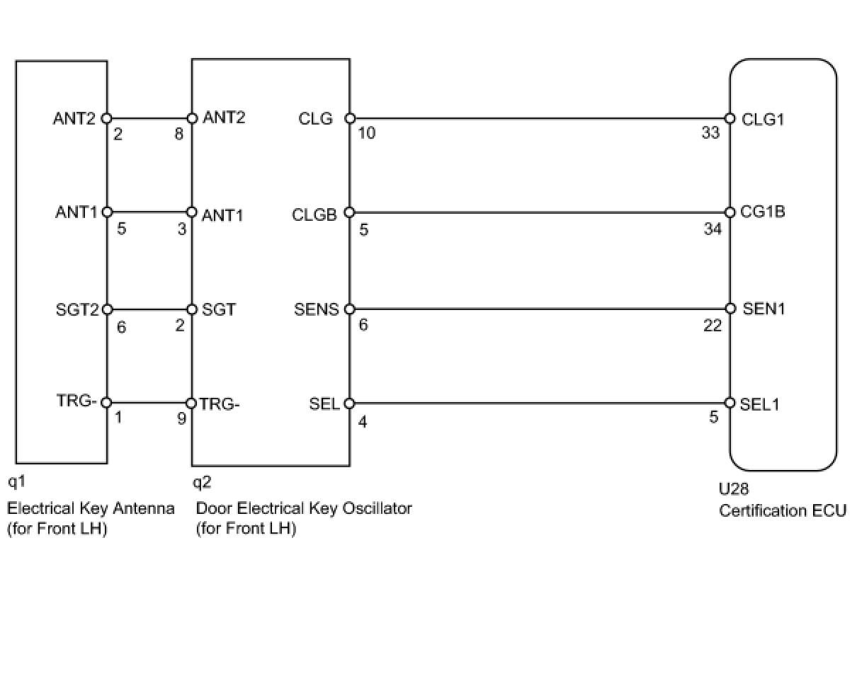 When an ID code from the door electrical key oscillator front LH matches an ID code from the key, the certification ECU outputs a SEL signal (Lo when output) to the door electrical key oscillator front LH, activates the touch sensor inside the outside door handle, and enters unlock standby mode. When the touch sensor is touched, the door electrical key oscillator front LH sends a SENS signal (Lo when output) to the certification ECU and the certification ECU sends an unlock signal to the driver side door lock.