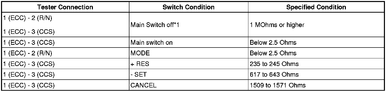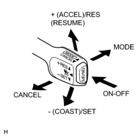 The cruise control main switch operates 8 functions: SET, COAST, TAP-DOWN, RESUME, ACCEL, TAP-UP, CANCEL and MODE. The SET, TAP-DOWN and COAST functions, and the RESUME, TAP-UP and ACCEL functions are operated with the same switch. The cruise control main switch is an automatic return type switch which turns on only while operating it in each arrow direction and turns off after releasing it. The internal contact point of the cruise control main switch is turned on with the switch operation. The ECM then reads the resistance value that has been changed by the switch operation to control MODE, SET, COAST, RESUME, ACCEL and CANCEL. The dynamic radar cruise control system has two cruise control modes: the constant speed control mode and vehicle-to-vehicle distance control mode.