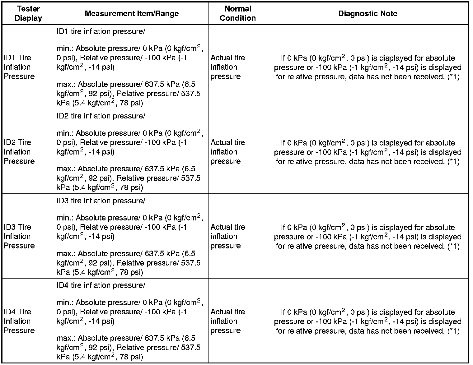 - The initialization is complete when the Data List "ID Tire Inflation Pressure" display shows the correct pressures.