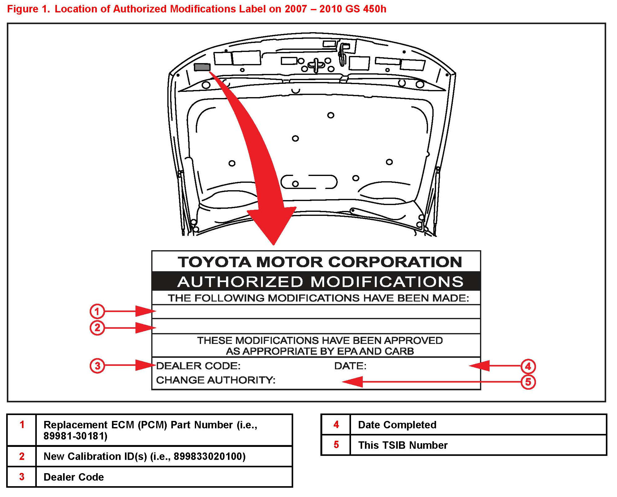 2. Check for the Authorized Modifications Label affixed to the vehicle in the location shown in Figure 1. Confirm the HV ECU calibration has been updated. If the calibration ID listed is NOT the latest HV ECU calibration go to step 3 and follow the repair procedure outlined in this TSIB.