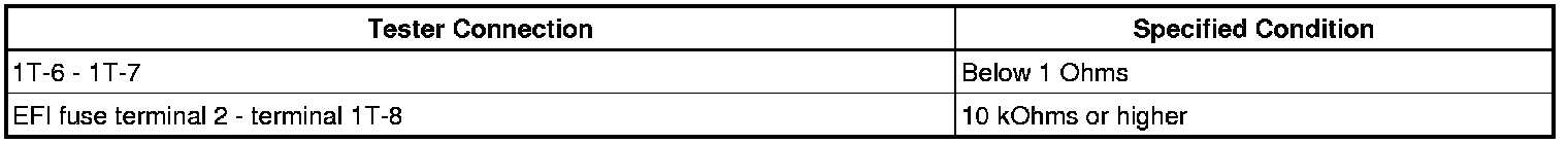 (2) Connect the battery's positive (+) lead to terminal 1T-6 and negative (-) lead to terminal 1T-7. Measure the resistance between EFI fuse terminal 2 and terminal 1T-8 when battery voltage is applied between the terminals.