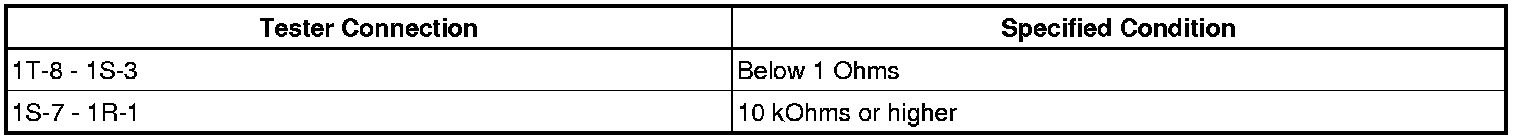 (2) Connect the battery's positive (+) lead to terminal 1T-8 and negative (-) lead to terminal 1S-3. Measure the resistance between terminals 1S-7 and 1R-1 when battery voltage is applied between the terminals.