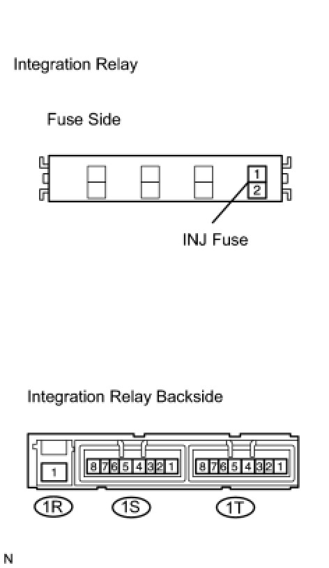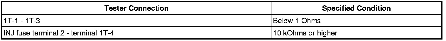 (2) Connect the battery's positive (+) lead to terminal 1T-1 and negative (-) lead to terminal 1T-3. Measure the resistance between INJ fuse terminals 2 and terminal 1T-4 when battery voltage is applied between the terminals.