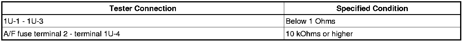 (2) Connect the battery's positive (+) lead to terminal 1U-1 and negative (-) lead to terminal 1U-3. Measure the resistance between A/F fuse terminals 2 and terminal 1U-4 when battery voltage is applied between the terminals.