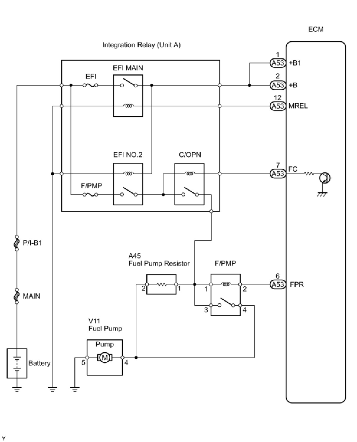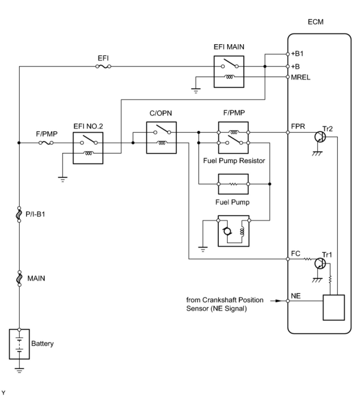 Based on vehicle driving conditions, the ECM operates the fuel pump. The ECM receives an engine start request signal from the hybrid vehicle control ECU. When the engine is cranked, an NE signal is sent to the ECM. When the engine is started, the ECM connects the FC circuit to the body ground, operates the C/OPN (circuit opening) relay, and operates the fuel pump.