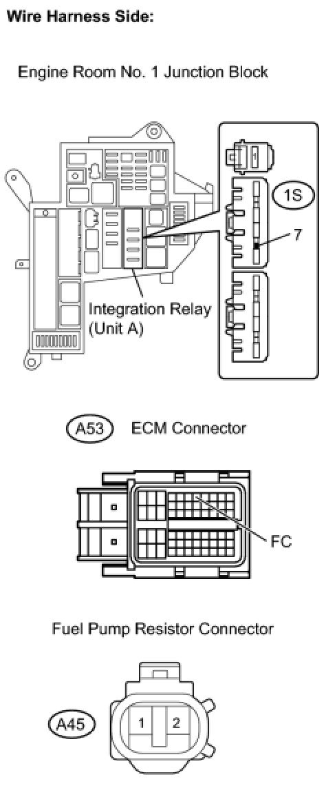 CHECK HARNESS AND CONNECTOR (INTEGRATION RELAY - ECM, INTEGRATION RELAY - FUEL PUMP RESISTOR)