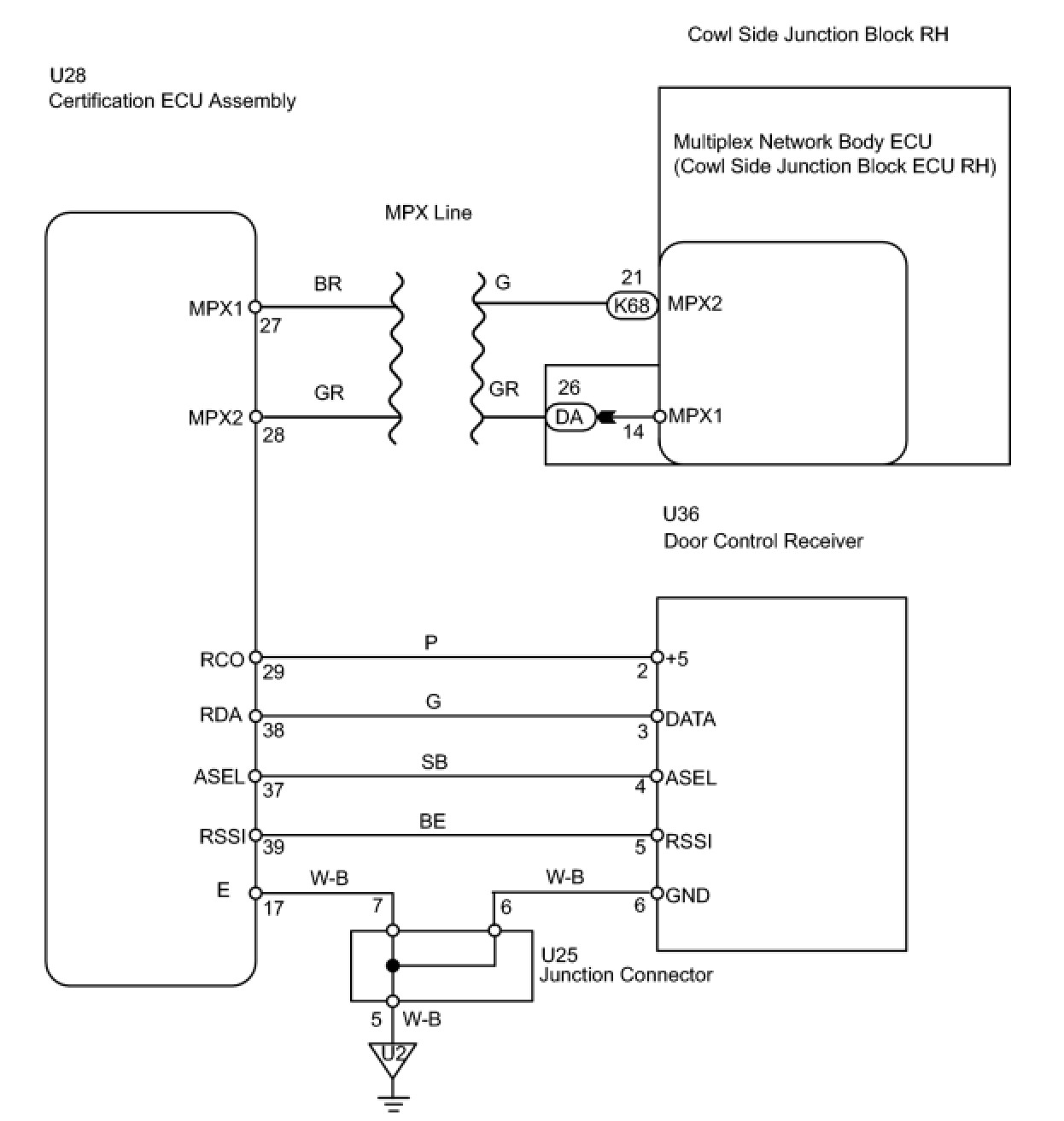 The door control receiver receives a signal from the transmitter and send signals to the multiplex network body ECU through the certification ECU assembly. The multiplex network body ECU then controls all doors by sending LOCK/UNLOCK signals to each door ECU, hazard flasher relay operation signals to the turn signals flasher relay (hazard warning lights) and wireless door lock buzzer sound signals to the wireless door lock buzzer.