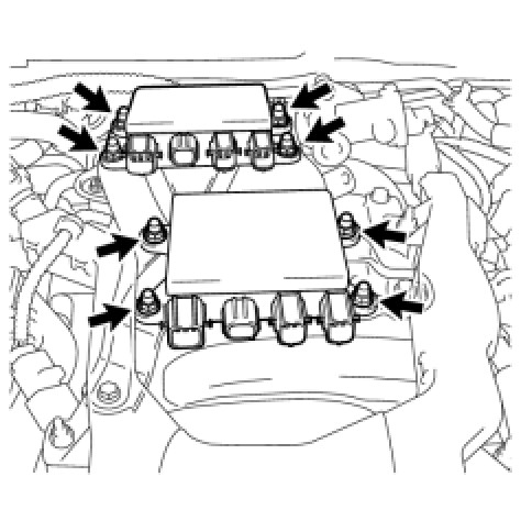 (b) Remove the 8 nuts and 2 injector drivers from the injector driver bracket.