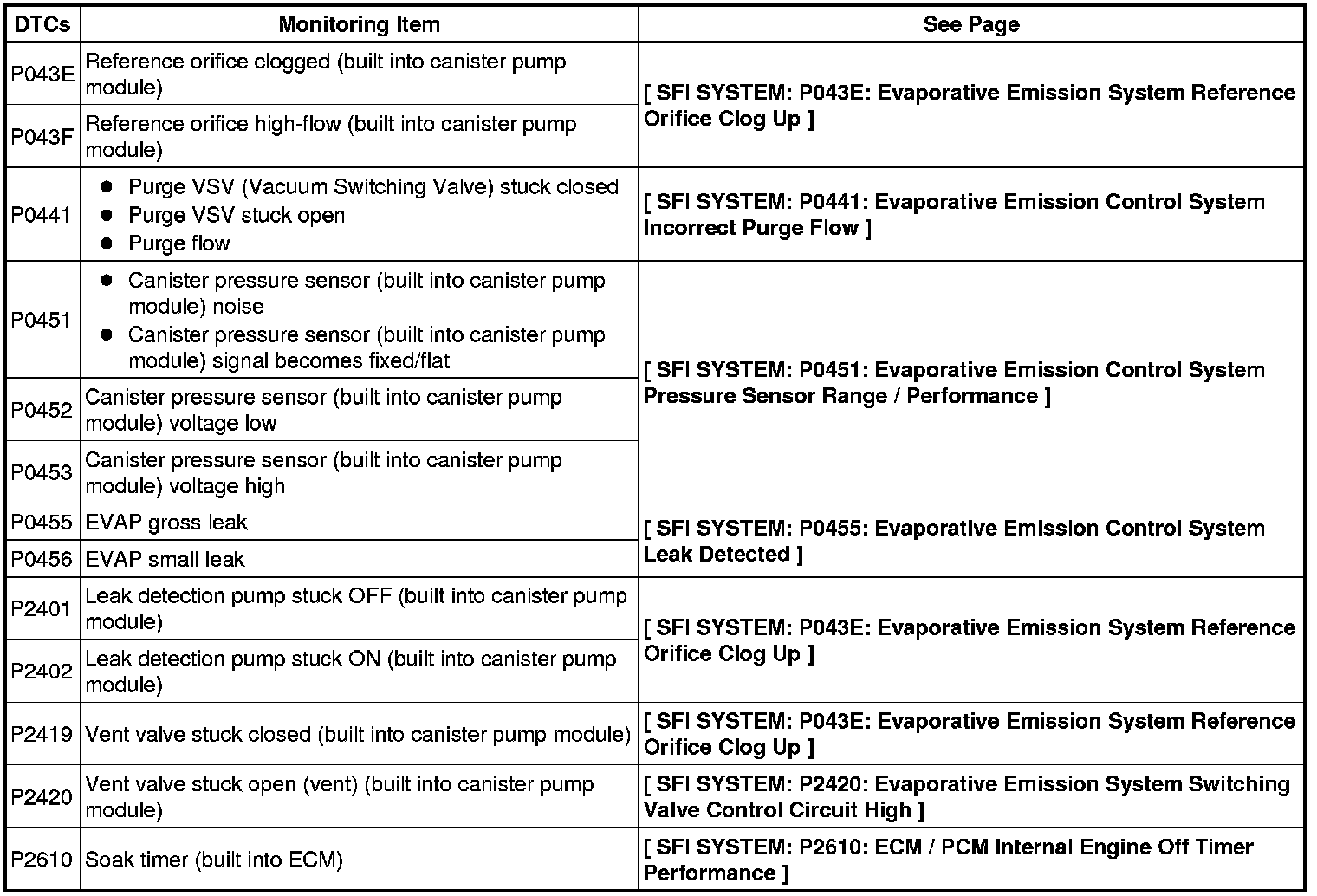 The leak detection pump creates negative pressure (vacuum) in the EVAP system and the pressure is measured. Finally, the ECM monitors for leaks from the EVAP system, and malfunctions in both the canister pump module and purge VSV, based on the EVAP pressure.