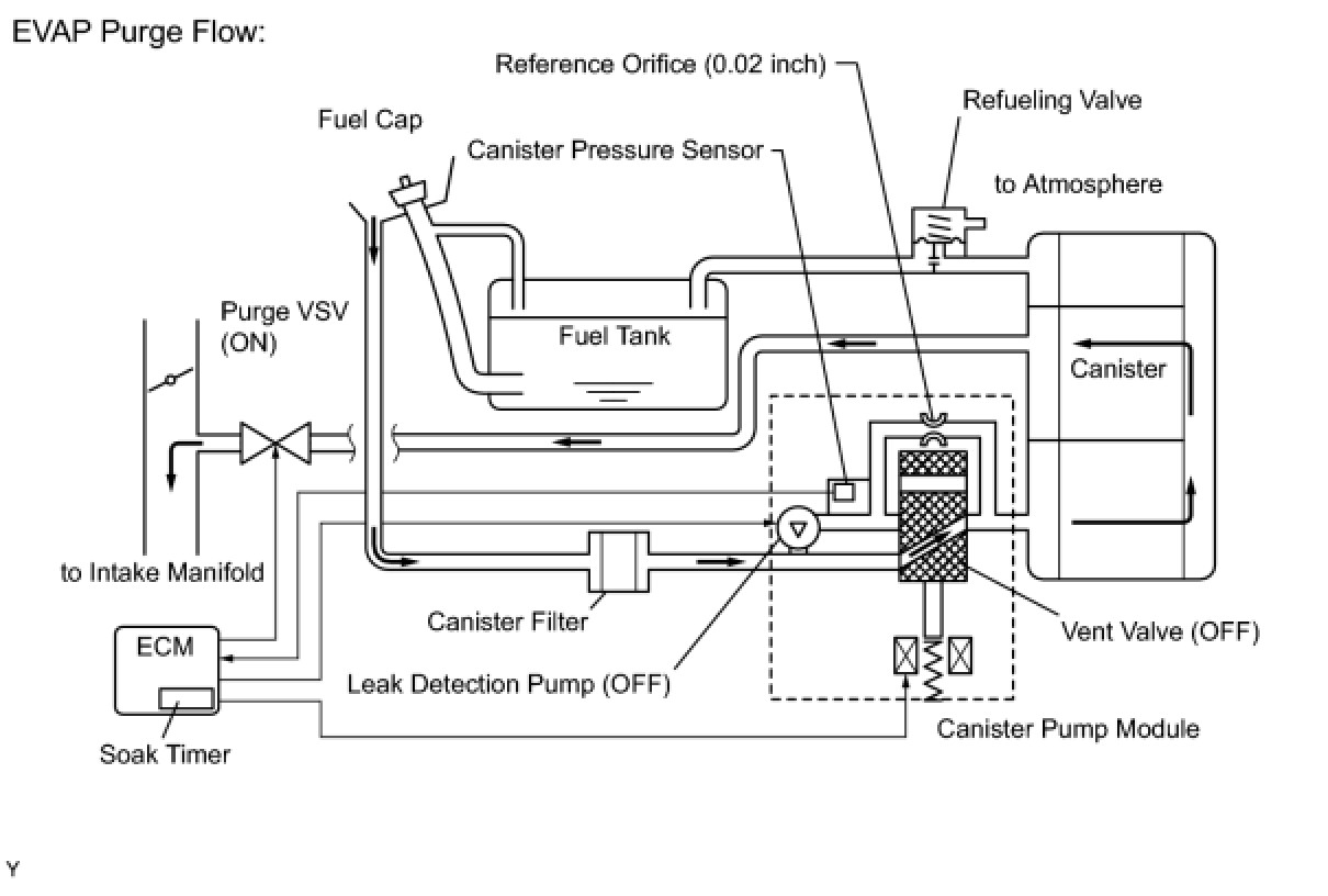While the engine is running, if a predetermined condition (closed-loop etc.) is met, the purge VSV is opened by the ECM and stored fuel vapors in the canister are purged into the intake manifold. The ECM changes the duty cycle ratio of the purge VSV to control purge flow volume.