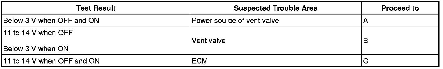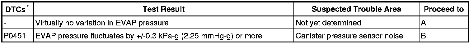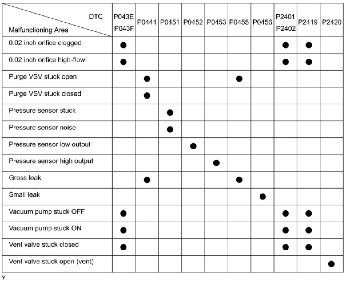 If any EVAP system DTCs are set, the malfunctioning area can be determined using the table below.