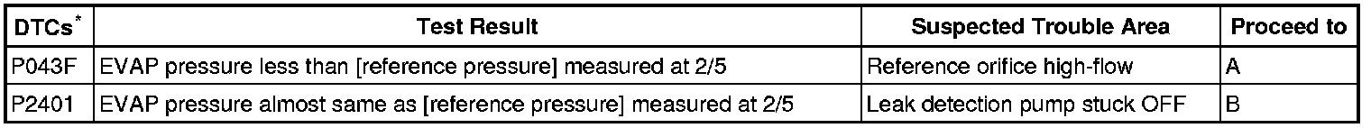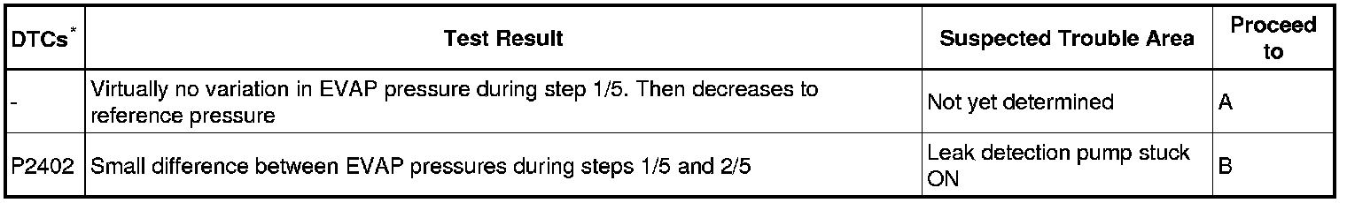 If the reference pressure difference between the first and second checks is greater than the specification, all the DTCs relating to the reference pressure (P043E, P043F, P2401, P2402 and P2419) are stored.