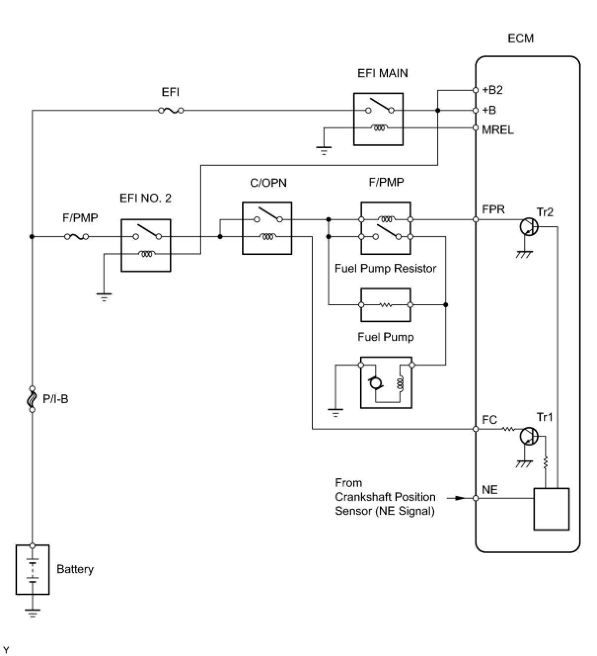 When the engine is cranked, a signal is sent from the power source control ECU's STSW terminal to the ECM's STSW terminal. Then voltage travels from the ECM's STAR terminal through the park/neutral position switch to the ST relay coil. The STAR terminal also sends a signal to the STA terminal. When the STA signal and NE signal are input to the ECM, Tr1 inside the ECM turns ON, which causes power to be supplied to the C/OPN relay coil (C/OPN ON). As a result, the F/PMP relay actuates, which causes the fuel pump to operate. If the engine is operating and NE signals are being output, Tr1 inside the ECM is ON (C/OPN ON), and the fuel pump will continue operating. The fuel pump has high and low speed settings. When the engine is starting or operating with a heavy load, Tr2 inside the ECM turns ON to actuate the F/PMP relay so that the fuel pump operates at the high speed setting. When the engine is idling or operating with a light load, Tr2 turns OFF, and current flows through the fuel pump resistor to the fuel pump so that the fuel pump operates at the low speed setting.