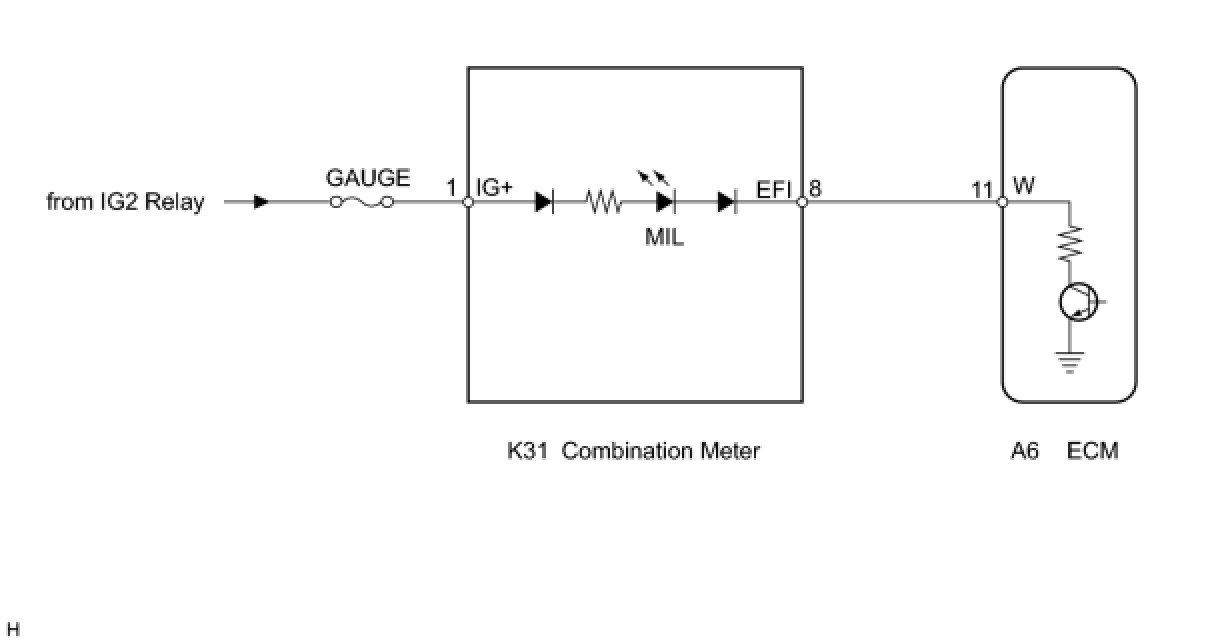 The MIL (Malfunction Indicator Lamp) is used to indicate vehicle malfunctions detected by the ECM. By turning the engine switch on (IG), power is supplied to the MIL circuit, and the ECM provides the circuit ground which illuminates the MIL.
