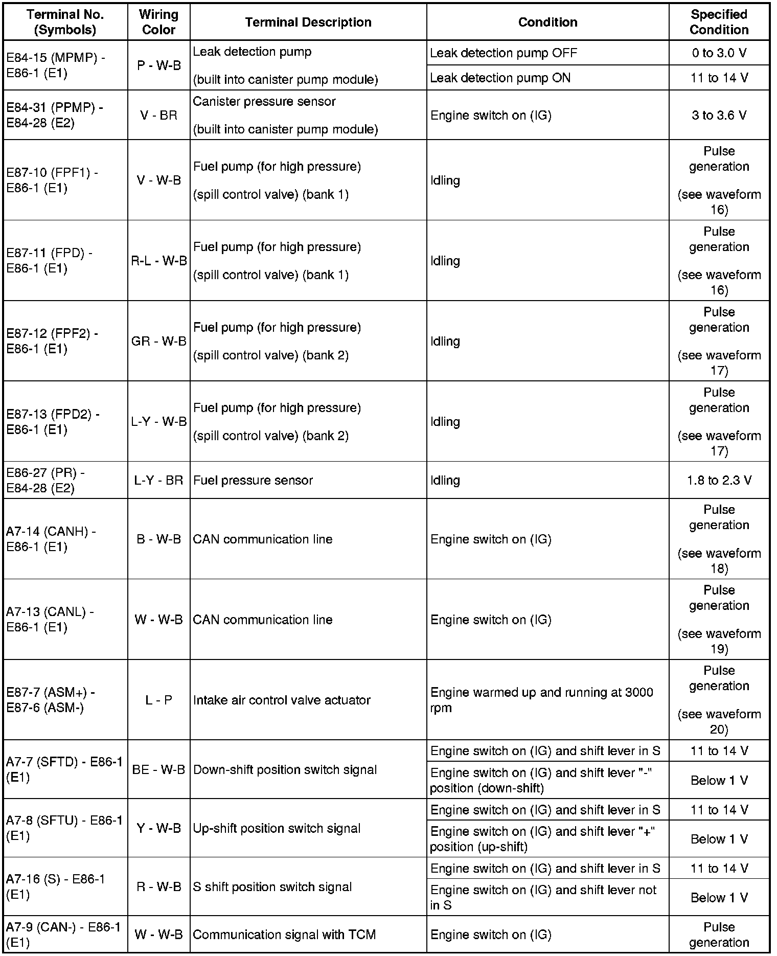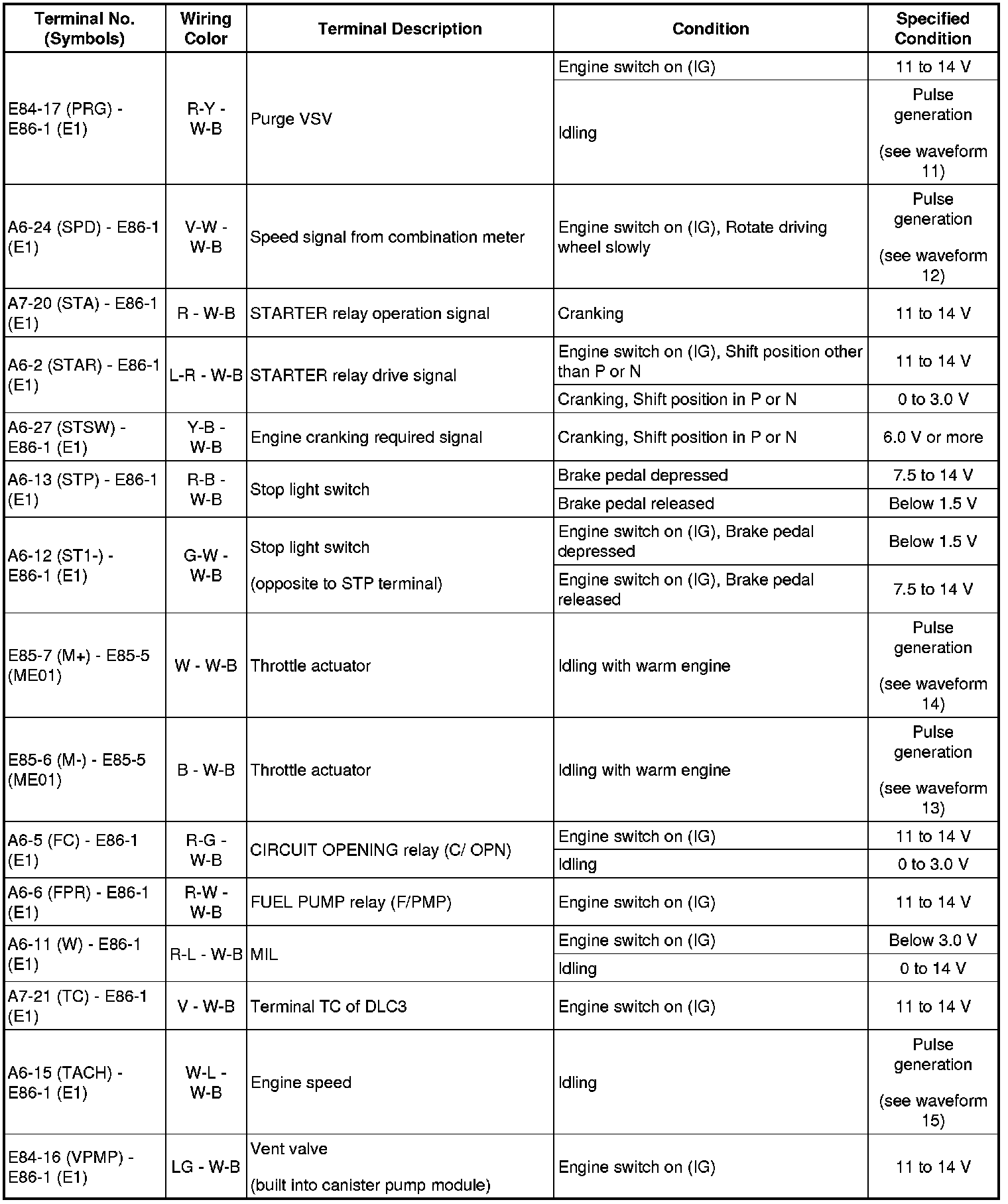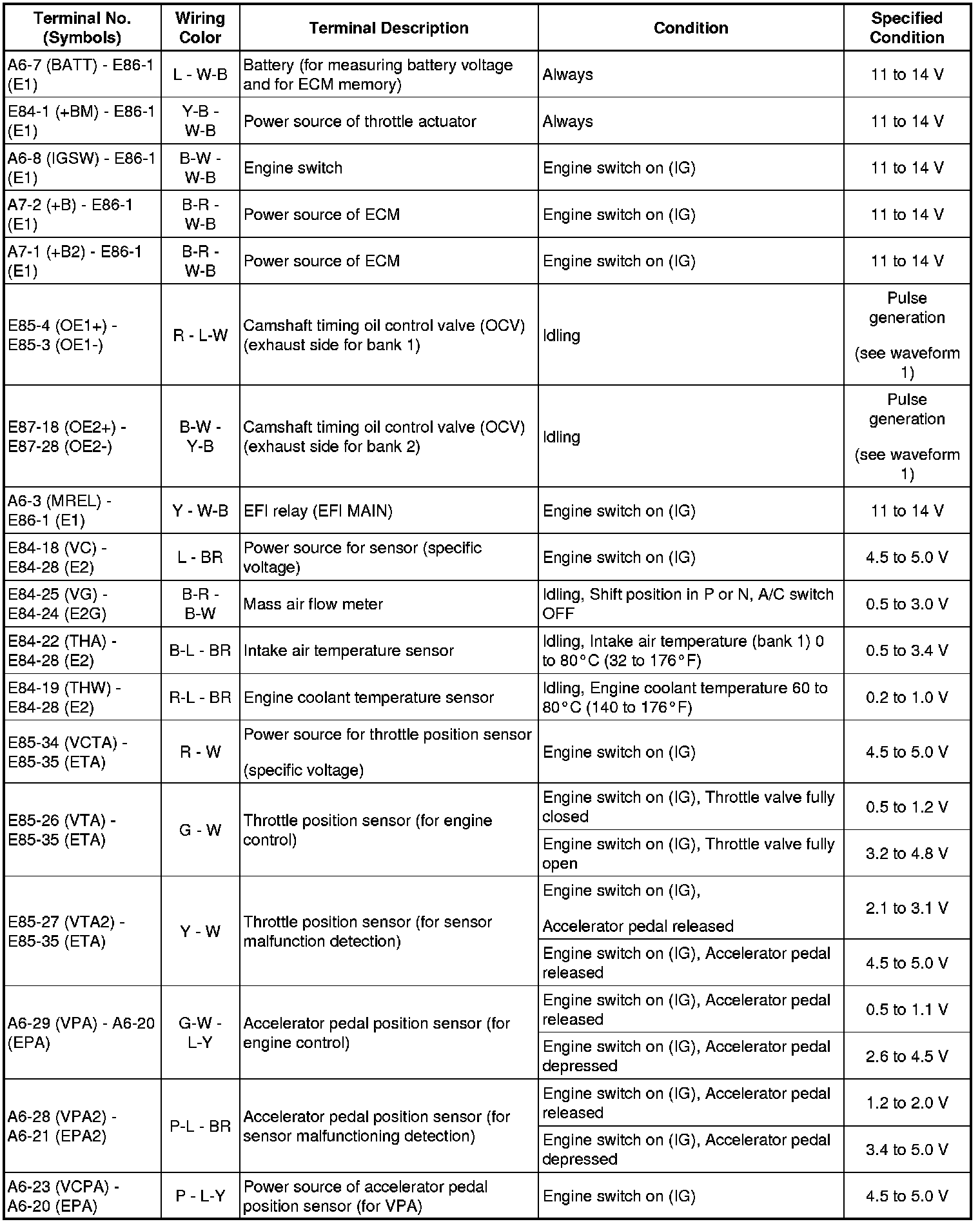 HINT: The standard normal voltage between each pair of the ECM terminals is shown in the table below. The appropriate conditions for checking each pair of the terminals are also indicated. The result of checks should be compared with the standard normal voltage for that pair of terminals, displayed in the Specified Condition column. The illustration above can be used as a reference to identify the ECM terminal locations.