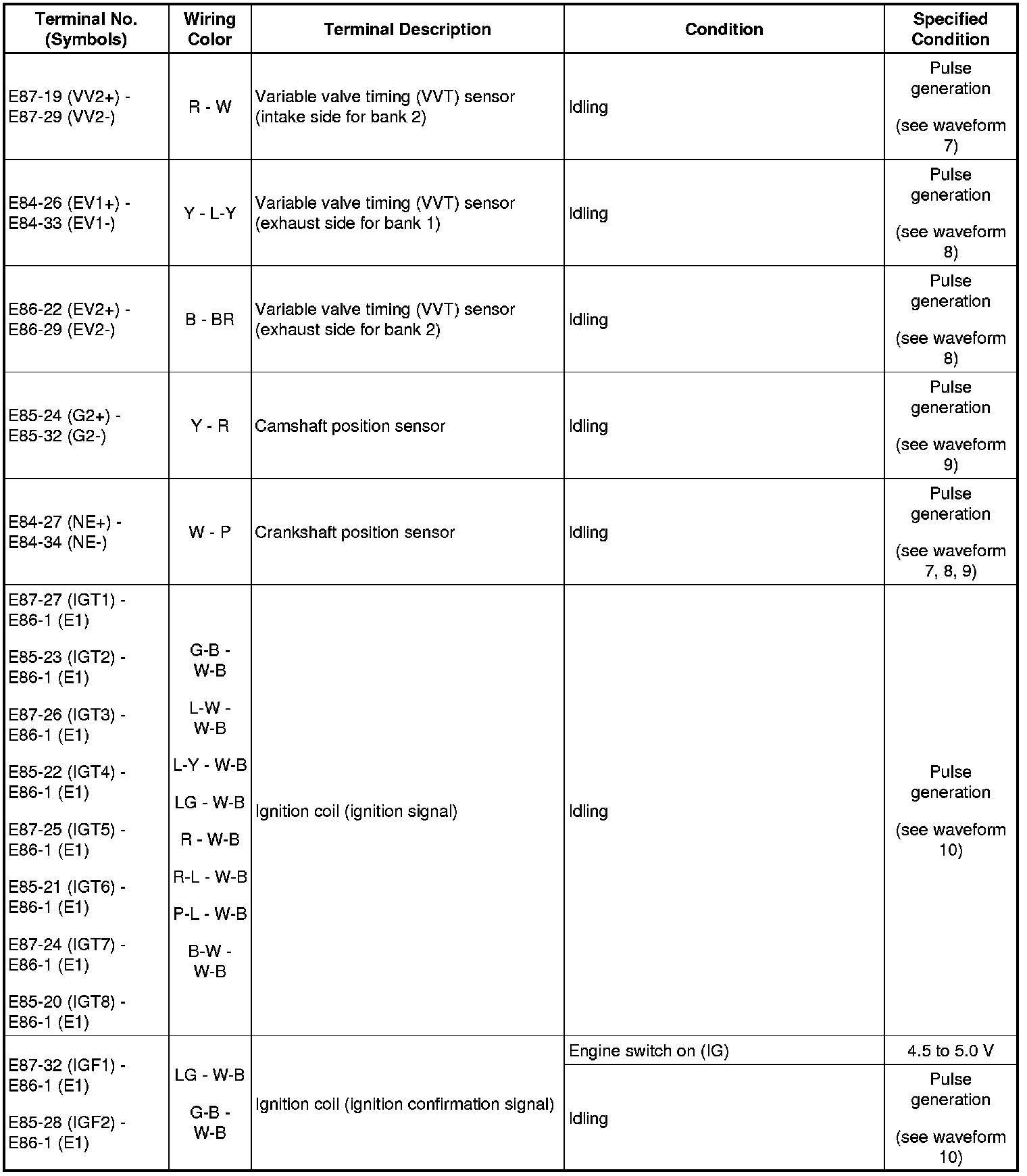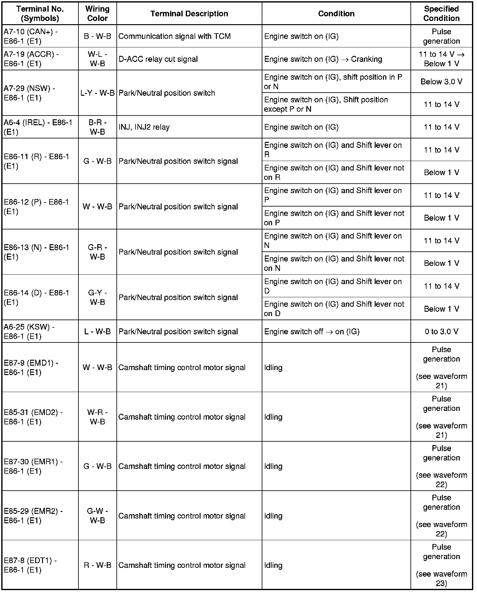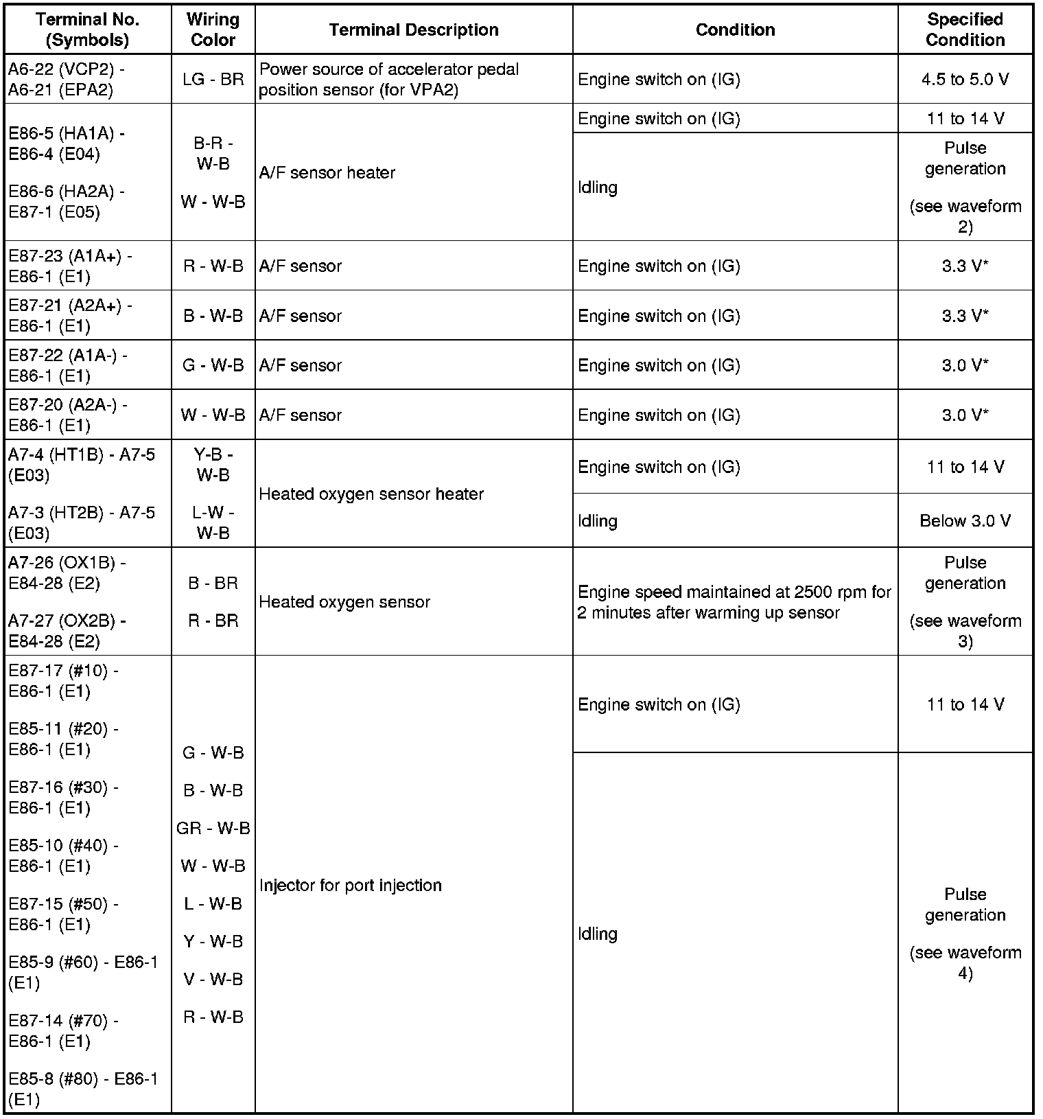 HINT: The standard normal voltage between each pair of the ECM terminals is shown in the table below. The appropriate conditions for checking each pair of the terminals are also indicated. The result of checks should be compared with the standard normal voltage for that pair of terminals, displayed in the Specified Condition column. The illustration above can be used as a reference to identify the ECM terminal locations.