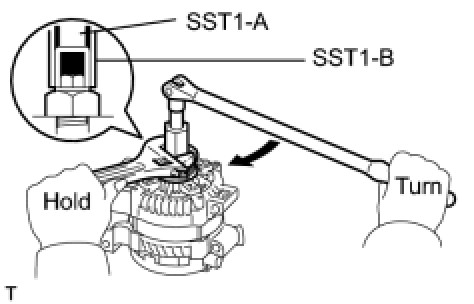 (d) While holding SST1-A on the pulley shaft area, tighten SST1-B to the specified torque.