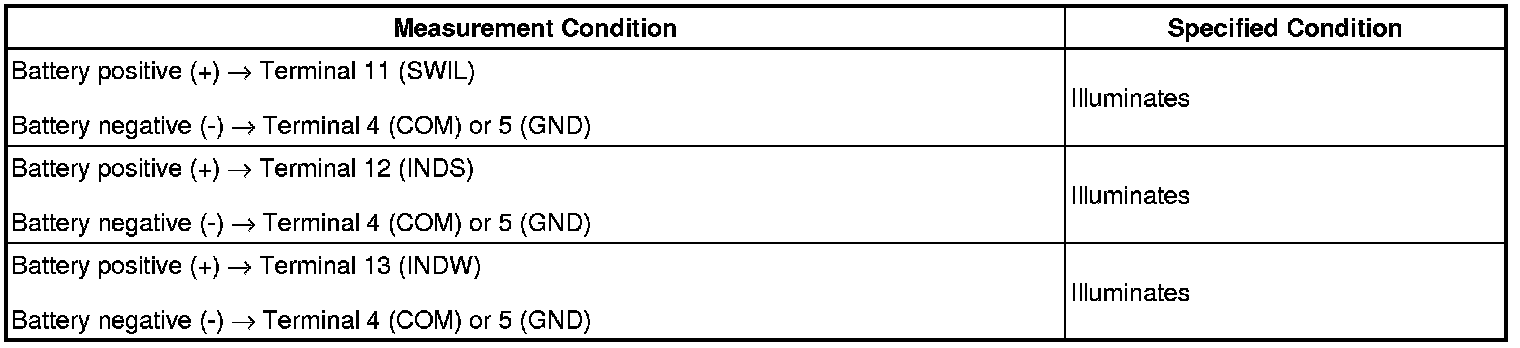 (b) Apply battery voltage between the terminals of the switch, and check the illumination condition of the switch.
