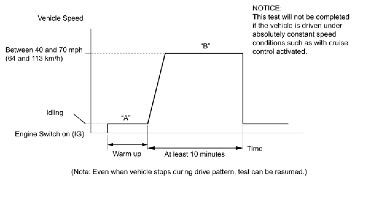 Drive the vehicle at between 40 mph and 70 mph (64 km/h and 113 km/h) for at least 10 minutes (Procedure "B")