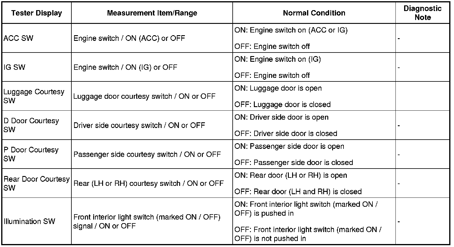 HINT: Using the Techstream to read the Data List allows the values or states of switches, sensors, actuators and other items to be read without removing any parts. This non-intrusive inspection can be very useful because intermittent conditions or signals may be discovered before parts or wiring is disturbed. Reading the Data List information early in troubleshooting is one way to save diagnostic time.
