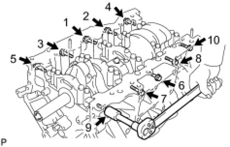 Install and uniformly tighten the 10 main bearing cap bolts and 10 seal washers in several steps, in the sequence shown in the illustration.
