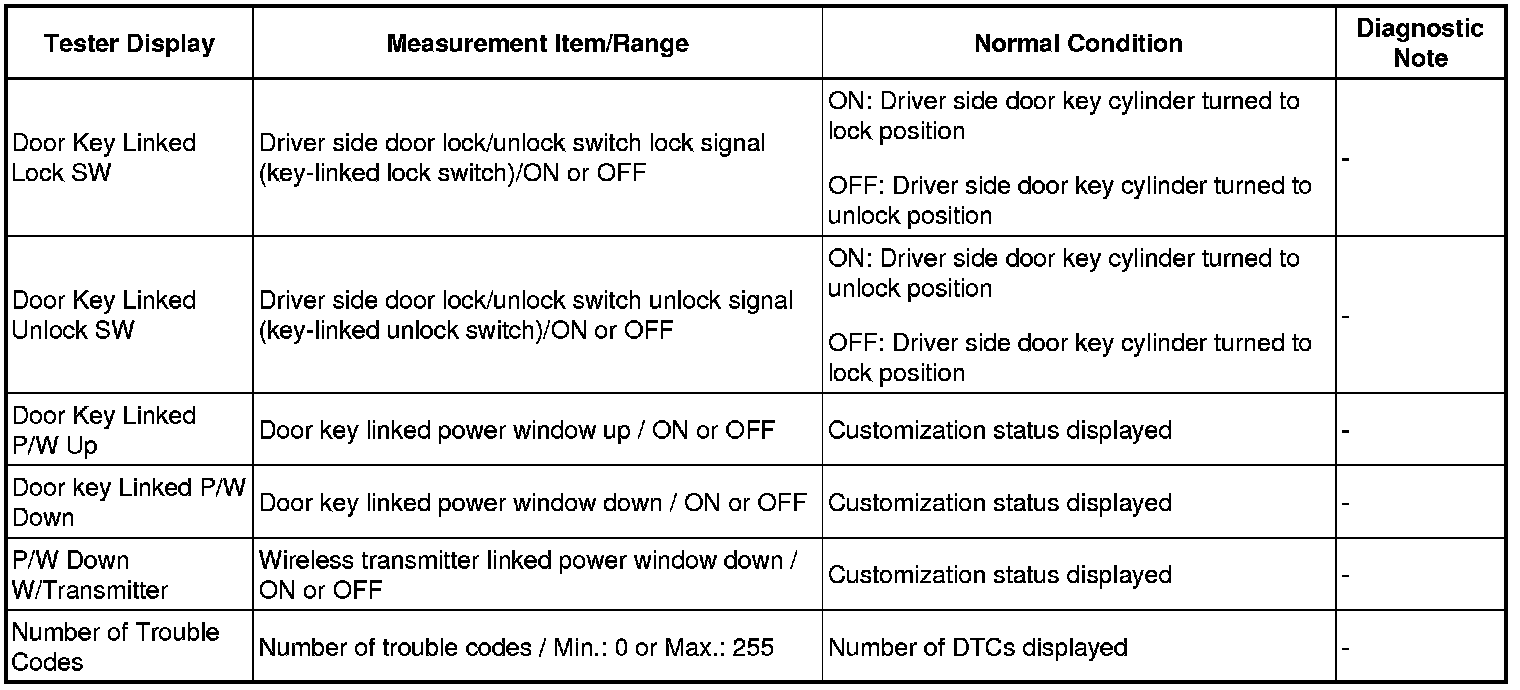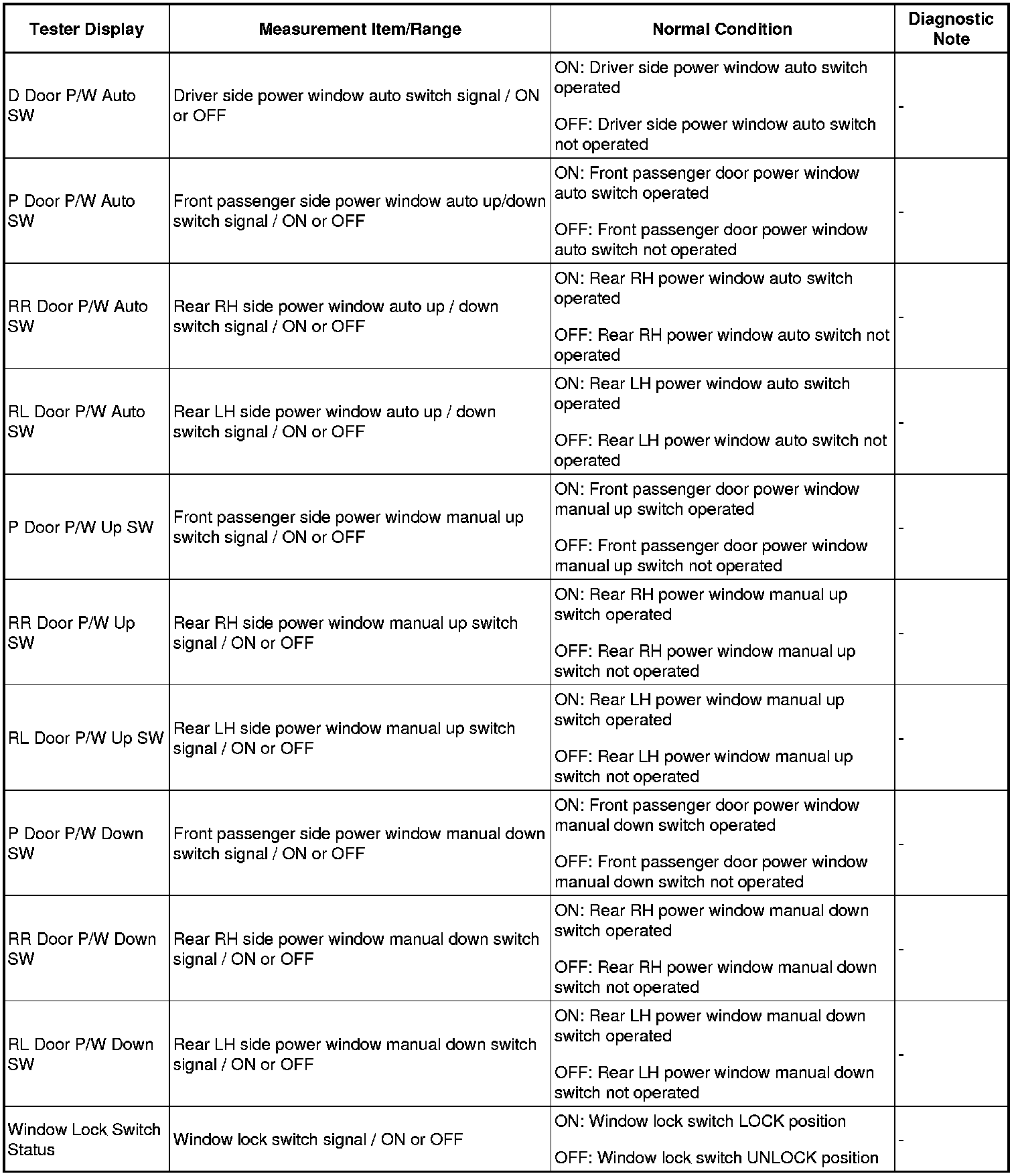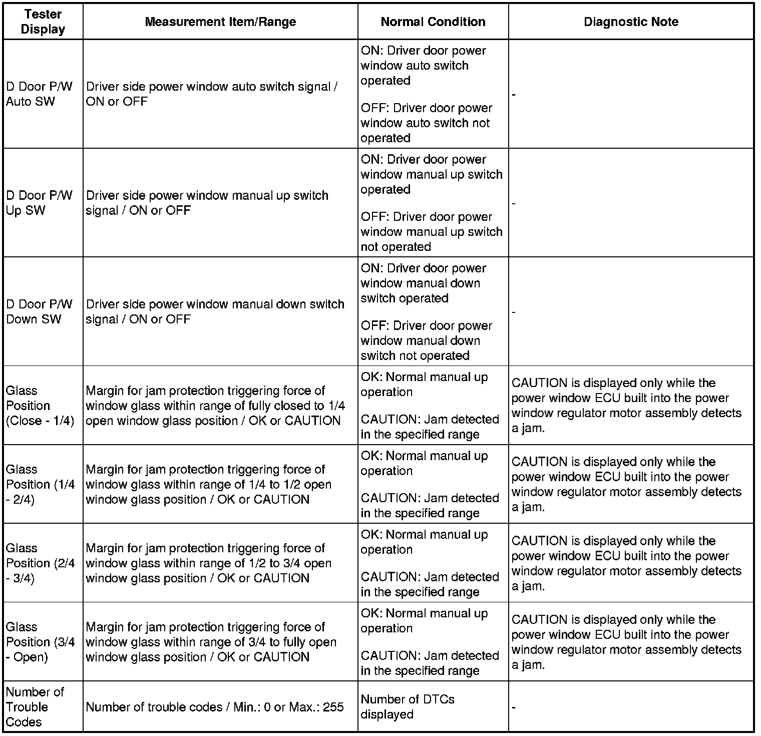 WINDOW / GLASS: POWER WINDOW CONTROL SYSTEM: DATA LIST / ACTIVE TEST