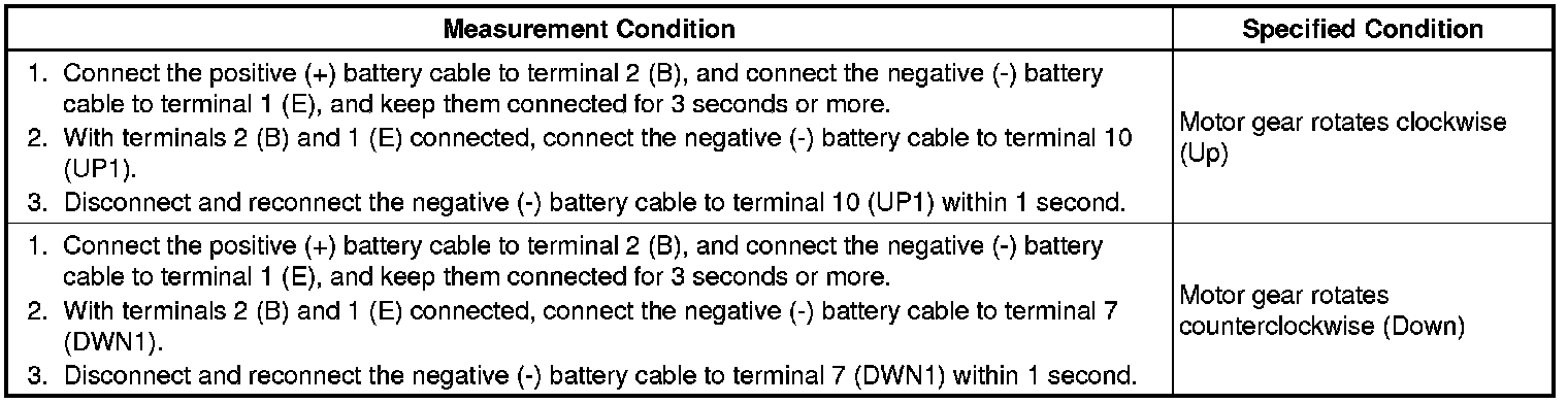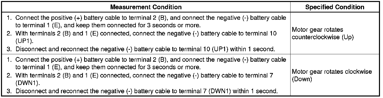 (b) Apply negative (-) battery voltage to connector terminals 1 (E) and 7 (DWN1) or 10 (UP1).