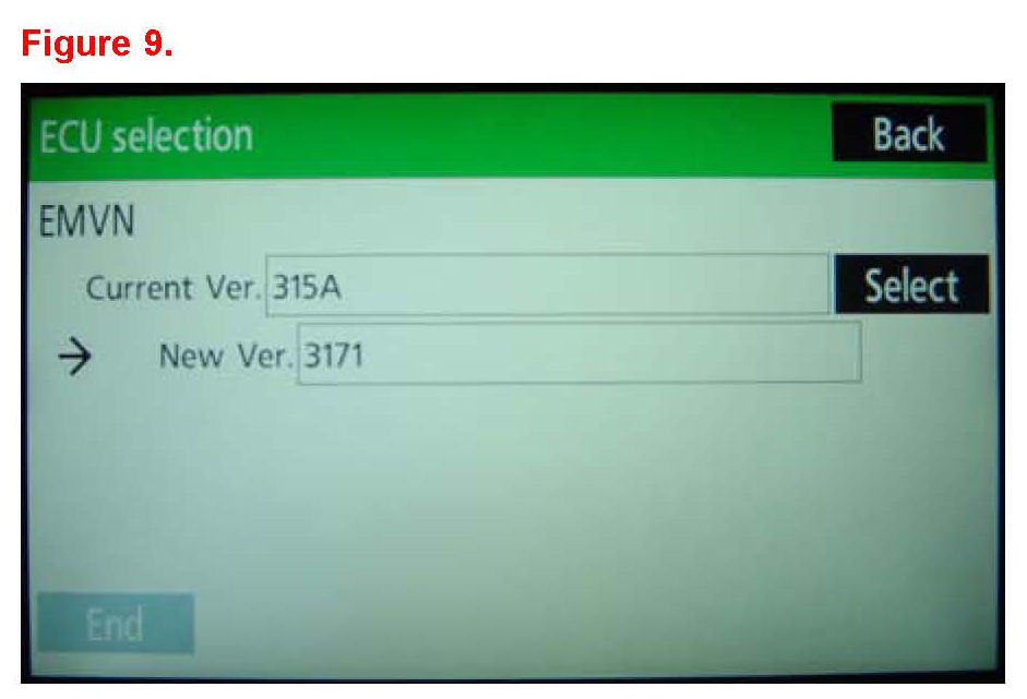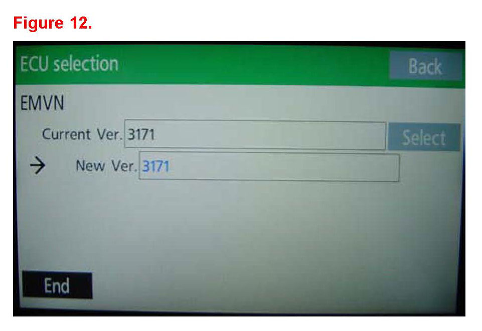 8. When the ECU Selection screen appears, confirm the current version is less than the NEW version. If yes, then press the Select button.