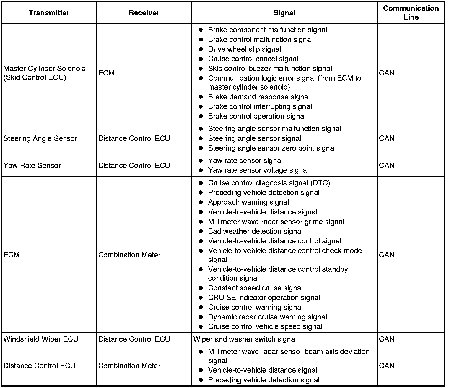 The distance control ECU determines the distance to the vehicle in front, relative speed, target decreasing speed and deceleration rate. Based on the data, the ECU may transmit a brake demand signal to the master cylinder solenoid (skid control ECU) via the ECM.