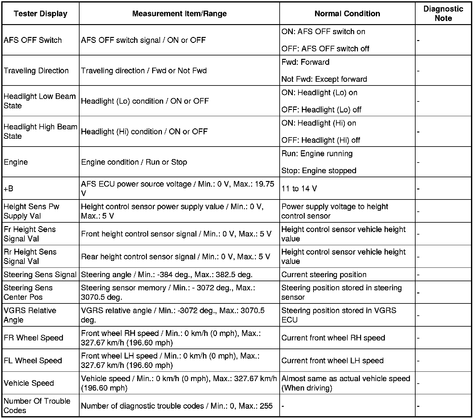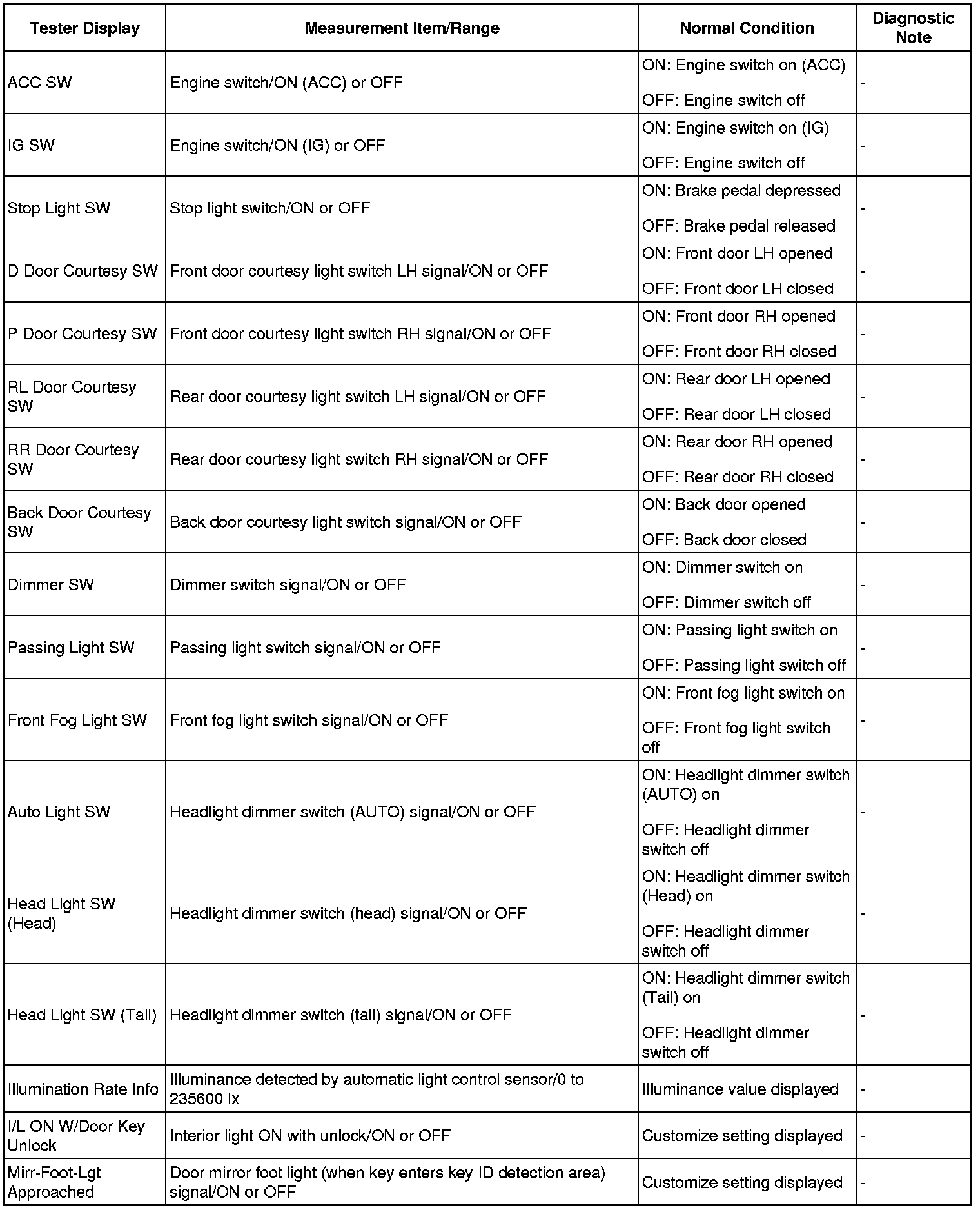 HINT: Using the Techstream to read the Data List allows the values or states of switches, sensors, actuators and other items to be read without removing any parts. This non-intrusive inspection can be very useful because intermittent conditions or signals may be discovered before parts or wiring is disturbed. Reading the Data List information early in troubleshooting is one way to save diagnostic time.