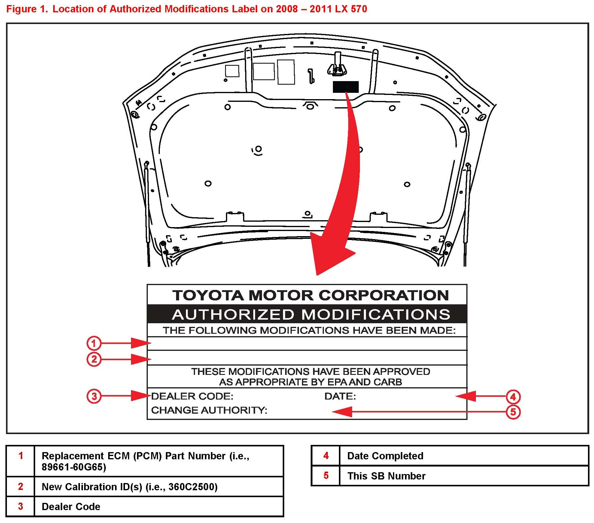 2. Check for the Authorized Modifications Label affixed to the vehicle in the location shown in Figure 1. Confirm if the ECM (PCM) calibration has been updated. If the calibration ID listed is NOT the latest ECM (PCM) calibration - go to step 3.