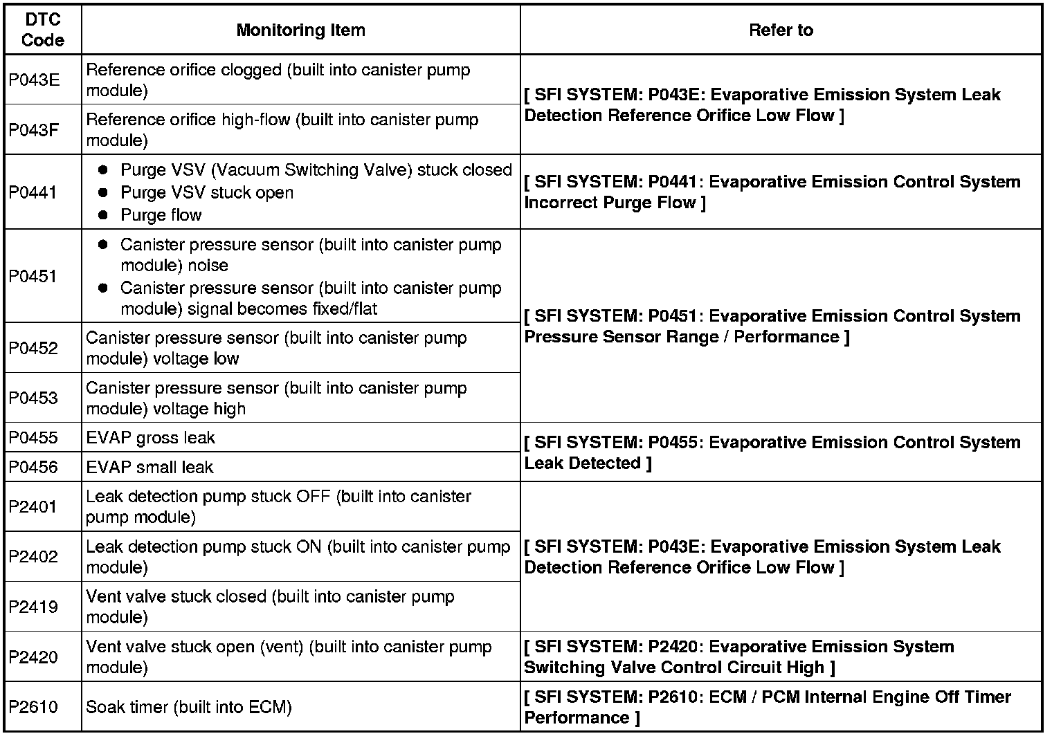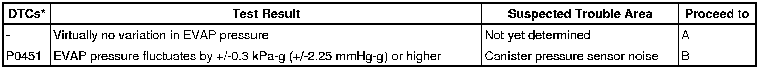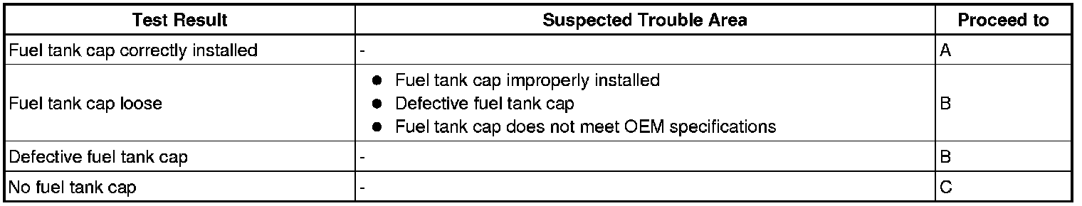 If any EVAP system DTCs are stored, the malfunctioning area can be determined using the table below.