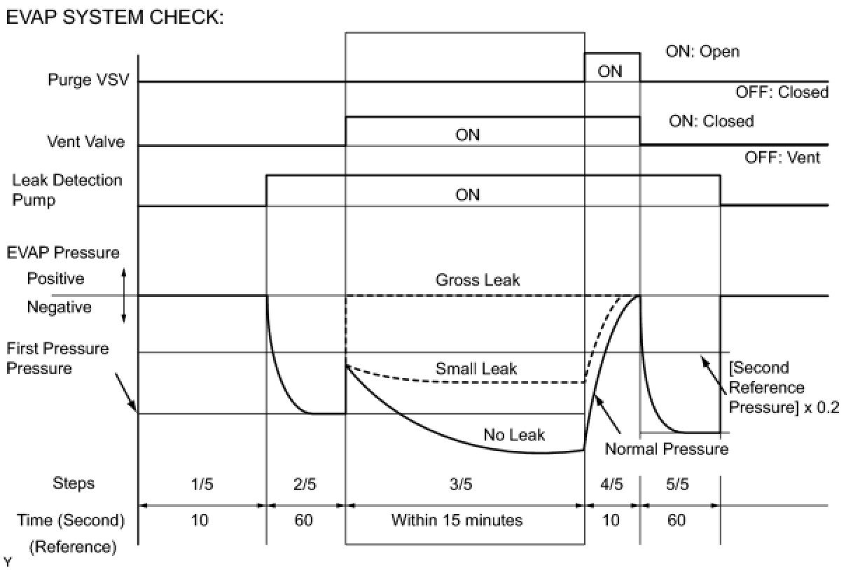 The leak detection pump creates negative pressure (vacuum) in the EVAP system and the pressure is measured. Finally, the ECM monitors for leaks from the EVAP system, and malfunctions in both the canister pump module and purge VSV, based on the EVAP pressure.