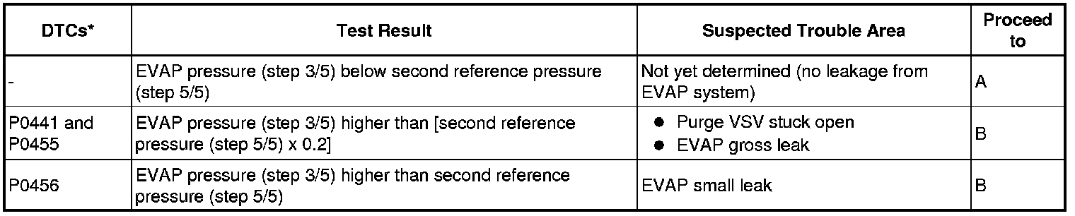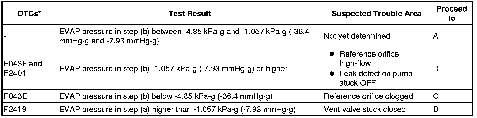 If the reference pressure difference between the first and second checks is more than the specification, all the DTCs relating to the reference pressure (P043E, P043F, P2401, P2402 and P2419) are stored.