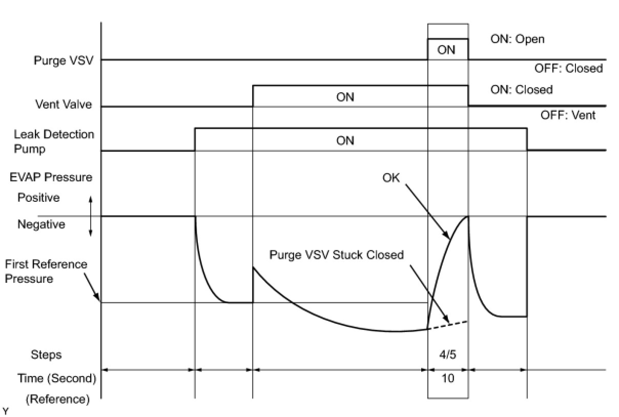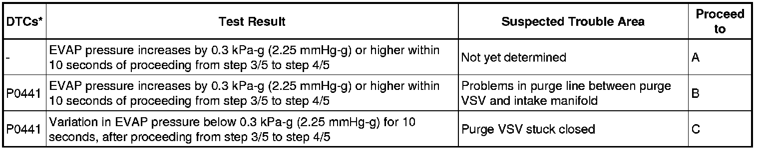 The vent valve is turned on (closed) and the EVAP pressure is measured. If the variation in the pressure is below 0.5 kPa-g (3.75 mmHg-g), the ECM interprets this as the purge VSV being stuck closed, illuminates the MIL and stores DTC P0441 (2 trip detection logic).