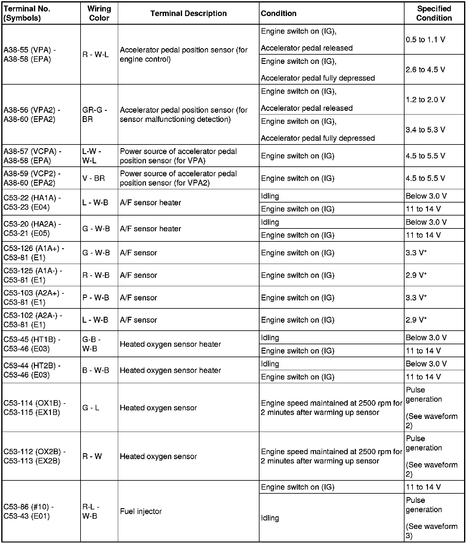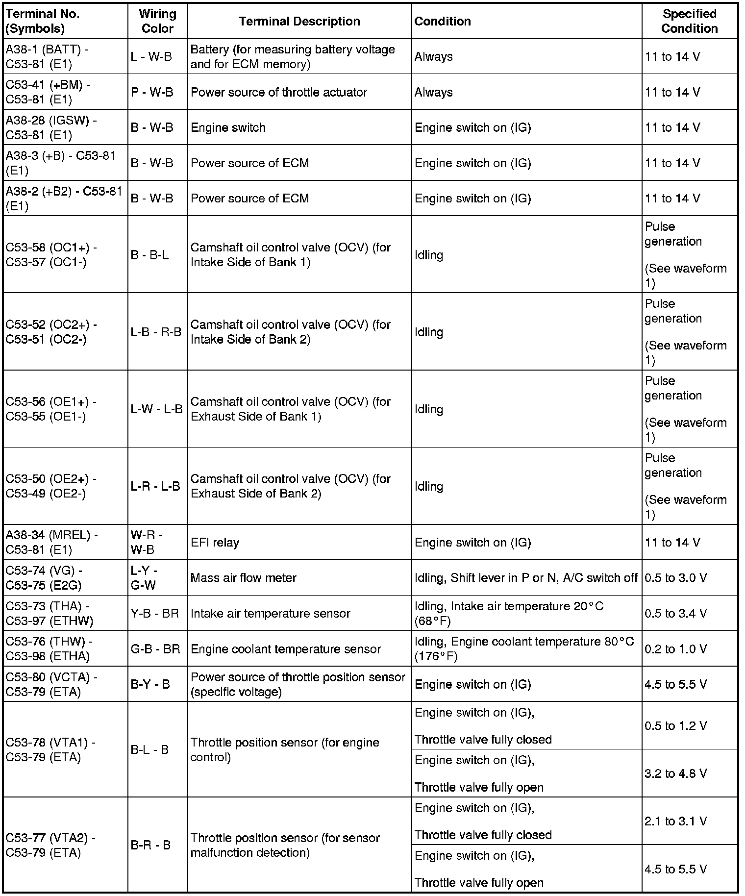 HINT: The standard normal voltage between each pair of ECM terminals is shown in the table below. The appropriate conditions for checking each pair of terminals are also indicated. The result of checks should be compared with the standard normal voltage for that pair of terminals, displayed in the Specified Condition column. The illustration above can be used as a reference to identify the ECM terminal locations.