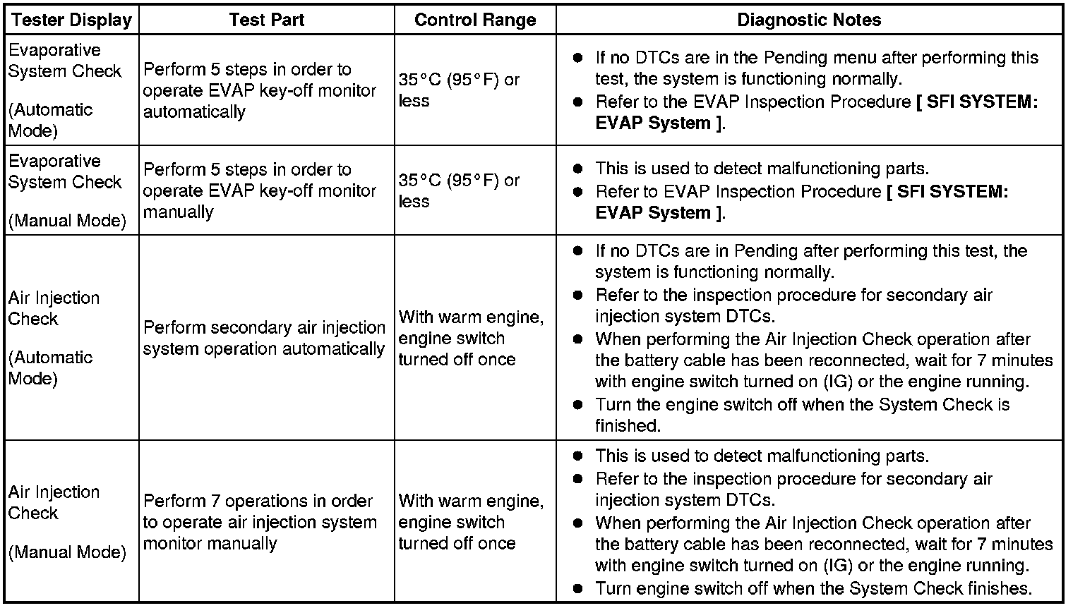 (e) Perform the System Check by referring to the table below.