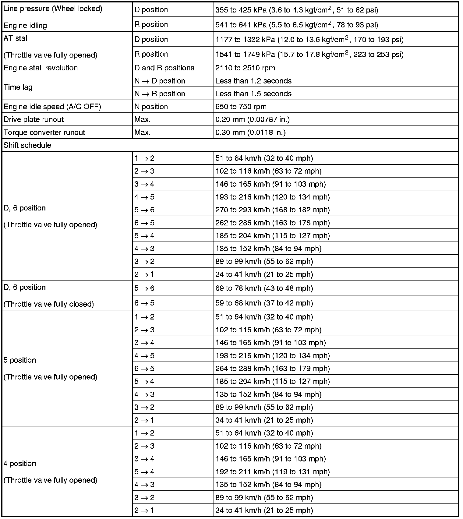 SPECIFICATIONS: AB60F AUTOMATIC TRANSMISSION / TRANSAXLE: SERVICE DATA